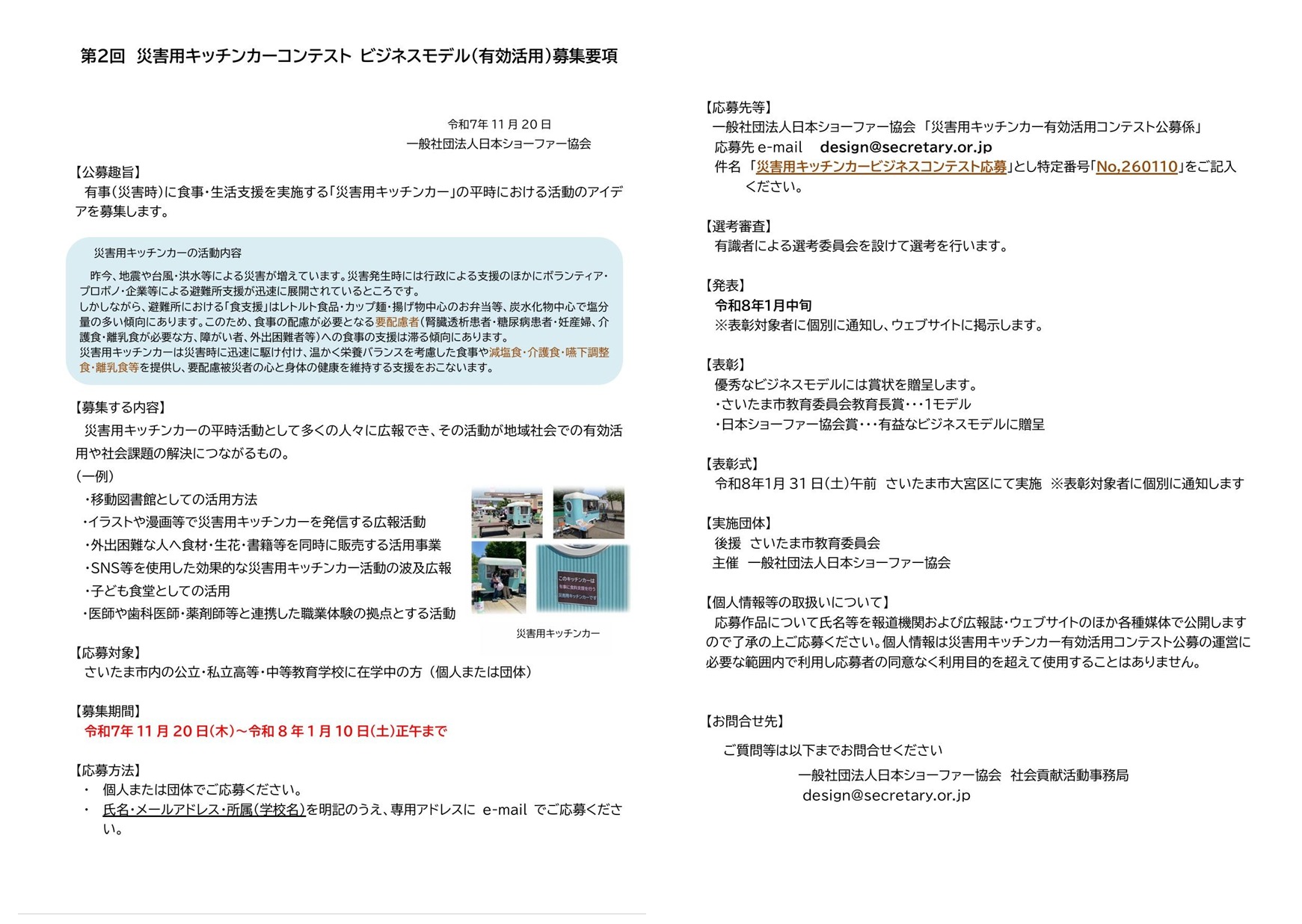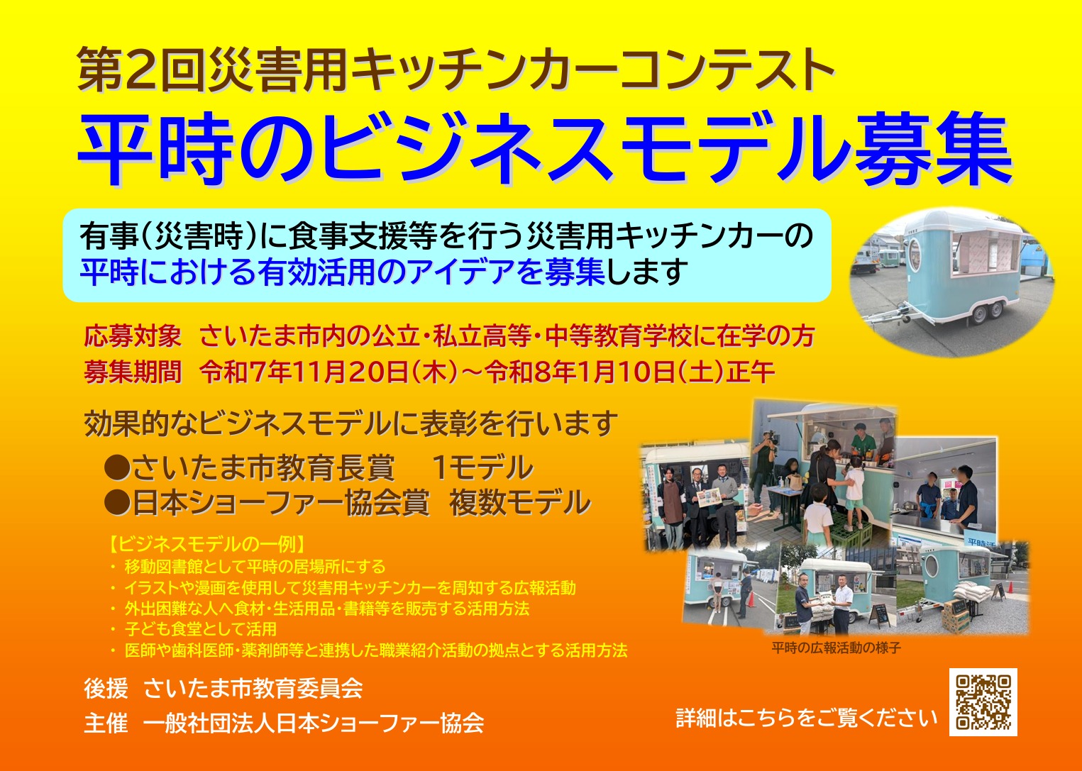●現在ウェブサイトを更新中です。最新情報は「お知らせ」をご覧ください。 secretary サポート事業 security guard secretary 役員秘書/秘書育成 ※第1回受賞団体 ウエルシア薬局株式会社・株式会社サイサン・株式会社埼玉りそな銀行・積水ハウス株式会社 & 秘書兼セキュリティ対応移動責任者 社会貢献活動 一般社団法人日本ショーファー協会・株式会社福島食品・株式会社武蔵野銀行 (7団体) executive chauffeur 役員車運行管理 これまでの助成・補助事業 tour concierge 人材育成/人事課題解決 旅行秘書 nursing trip ケア旅行 chauffeured care 民間救急車/生活介助 recruitment agency 人材紹介 human resources development 企業評価/リファレンスチェック corporate evaluate/refarence check ●災害用キッチンカーデザインの表彰式を行いました (令和7年3月) 埼 玉 県 知 事 表 彰 第1回SAITAMA社会貢献賞受賞 車両を使用した地域貢献活動に対し、令和5年2月17日大野元裕埼玉県知事 よりSAITAMA社会貢献賞をいただきました。 ・ 独自の検定制度による交通安全教育など独自性のある取組を実施している 受賞理由 ・ ジャストインタイム方式による効果的な食料支援を実施している ・ 所有車両を使用した防犯・見守り活動 ― 良好な治安は最大の社会福祉 ― ・ くるま検定等の交通安全教育 ― 低年齢からの意識付け ― 災害用キッチンカーは被災地に迅速に駆け付け、温かく栄養バランスを考慮した食事や減塩食・介護食・嚥下調整食・離乳食等を提供し、要配慮被災者の心と身体の健康を維持する支援をおこないます。有事に必要となる人的・物質的支援の体制を平時から構築し、発災時には被災地等に出動する「災害用キッチンカー」の周知啓発に相応しいデザインを募集します。 ・ 民間救急車等を活用した無償の食料配送 ― 孤立を生まない地域社会の実現 ― 表彰 : さいたま市長賞 ・ さいたま市教育長賞 ・ あらい太朗さんによる表彰状 後援 : さいたま市 ・ さいたま市教育委員会 期間 : 令和6年12月1日~令和7年年1月25日(金) 主な活動内容 ●お知らせ ●令和7年度の社会貢献活動は、財団等の助成・補助を受け行っています 埼 玉 県 知 事 表 彰 第1回SAITAMA社会貢献賞受賞 車両を使用した地域貢献活動に対し、令和5年2月17日大野元裕埼玉県知事 よりSAITAMA社会貢献賞をいただきました。 ・ 独自の検定制度による交通安全教育など独自性のある取組を実施している 受賞理由 ・ ジャストインタイム方式による効果的な食料支援を実施している ・ 所有車両を使用した防犯・見守り活動 ― 良好な治安は最大の社会福祉 ― ・ くるま検定等の交通安全教育 ― 低年齢からの意識付け ― ・ 民間救急車等を活用した無償の食料配送 ― 孤立を生まない地域社会の実現 ― 表彰 : さいたま市長賞 ・ さいたま市教育長賞 ・ あらい太朗さんによる表彰状 後援 : さいたま市 ・ さいたま市教育委員会 ※現在ウェブサイト更新中です。最新情報は事務局までお問い合わせください。 ●災害用キッチンカーが内閣府の制度に登録されました (令和7年7月) ●第2回災害用キッチンカーコンテストを行います (令和7年11月) 主な活動内容 ●お知らせ Copyright 2024 Association of Japan Chauffeur サイトは著作権により保護されています。転載・無断転用はご遠慮ください。