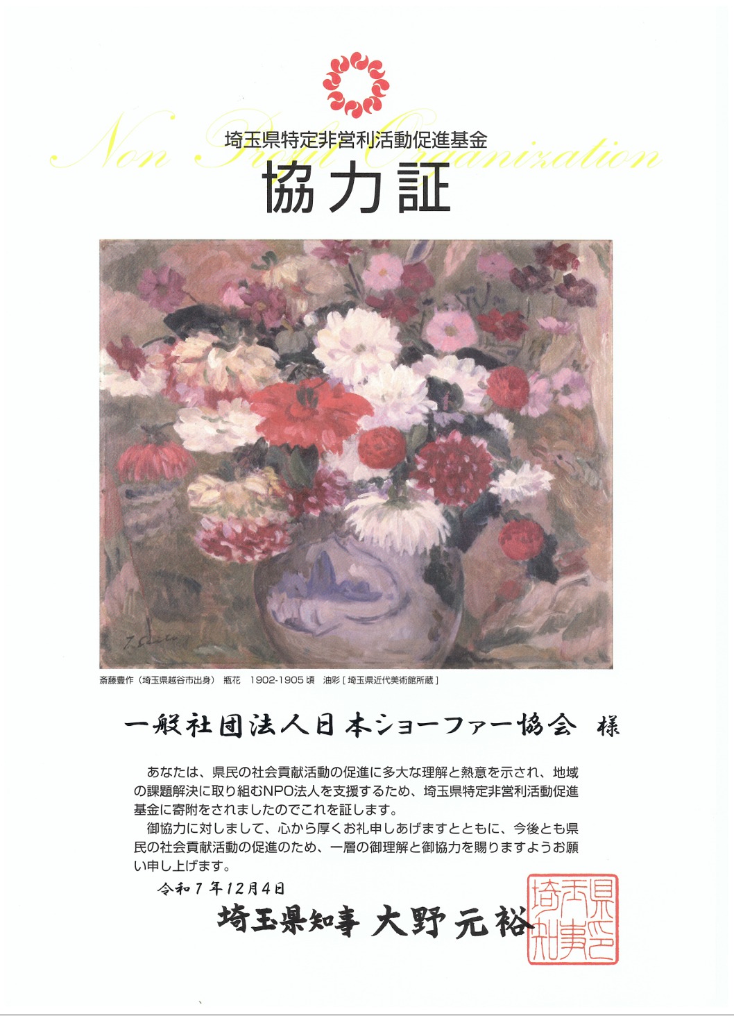 ●現在ウェブサイトを更新中です。最新情報は「お知らせ」をご覧ください。 secretary サポート事業 security guard secretary 役員秘書/秘書育成 ※第1回受賞団体 ウエルシア薬局株式会社・株式会社サイサン・株式会社埼玉りそな銀行・積水ハウス株式会社 & 秘書兼セキュリティ対応移動責任者 社会貢献活動 一般社団法人日本ショーファー協会・株式会社福島食品・株式会社武蔵野銀行 (7団体) executive chauffeur 役員車運行管理 これまでの助成・補助事業 tour concierge 人材育成/人事課題解決 旅行秘書 nursing trip ケア旅行 chauffeured care 民間救急車/生活介助 recruitment agency 人材紹介 human resources development 企業評価/リファレンスチェック corporate evaluate/refarence check ●災害用キッチンカーデザインの表彰式を行いました (令和7年3月) ●令和7年度の社会貢献活動は、財団等の助成・補助を受け行っています 埼 玉 県 知 事 表 彰 第1回SAITAMA社会貢献賞受賞 車両を使用した地域貢献活動に対し、令和5年2月17日大野元裕埼玉県知事 よりSAITAMA社会貢献賞をいただきました。 ・ 独自の検定制度による交通安全教育など独自性のある取組を実施している 受賞理由 ・ ジャストインタイム方式による効果的な食料支援を実施している ・ 所有車両を使用した防犯・見守り活動 ― 良好な治安は最大の社会福祉 ― ・ くるま検定等の交通安全教育 ― 低年齢からの意識付け ― ・ 民間救急車等を活用した無償の食料配送 ― 孤立を生まない地域社会の実現 ― 表彰 : さいたま市長賞 ・ さいたま市教育長賞 ・ あらい太朗さんによる表彰状 後援 : さいたま市 ・ さいたま市教育委員会 関係者で「生マシュマロ・ギモーヴ協会」を設立しました(令和7年8月) 大野埼玉県知事より協力証をいただきました(令和7年11月) 弊会の「SAITAMA生マシュマロ」が選ばれました (令和7年11月) 創設しました。弊会が事務局機能を担当します (令和7年7月) ●埼玉県庁オープンデーへの災害用キッチンカー出展および寄付により ●Made in SAITAMA 優良加工食品大賞2026の最終選考商品に ●災害時の災害食・介護食としても有益なマシュマロの普及・啓発を目的に ●さいたま市内の企業・団体で社会貢献活動の実施団体「まちぽかネット」を ●災害用キッチンカーが内閣府の制度に登録されました (令和7年7月) ●第2回災害用キッチンカーコンテストを行います さいたま市教育委員会 後援 (令和7年11月) 主な活動内容 ●お知らせ Copyright 2024 Association of Japan Chauffeur サイトは著作権により保護されています。転載・無断転用はご遠慮ください。