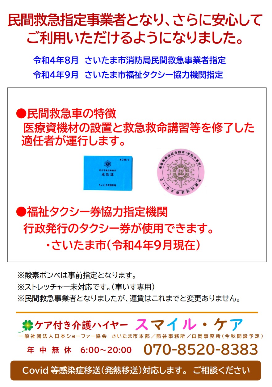 昼間・夜間 民間救急車・介護ハイヤー SmileCare スマイルケア